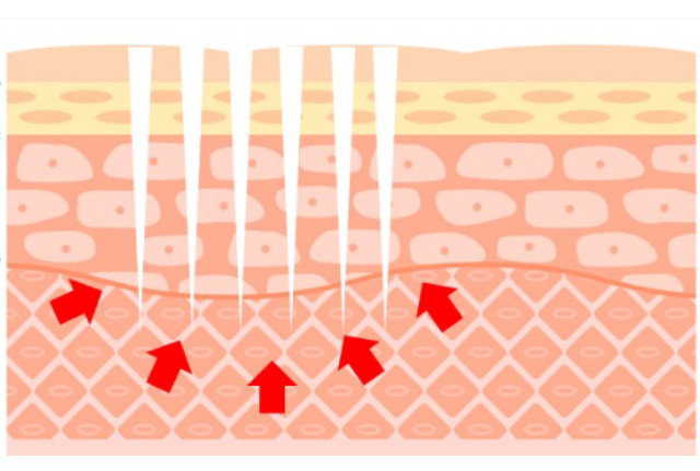 肌が傷つけられると修復しようとする働きが発生する為、盛り上がりと凹みの周辺が目立たなくなる効果を発揮します。